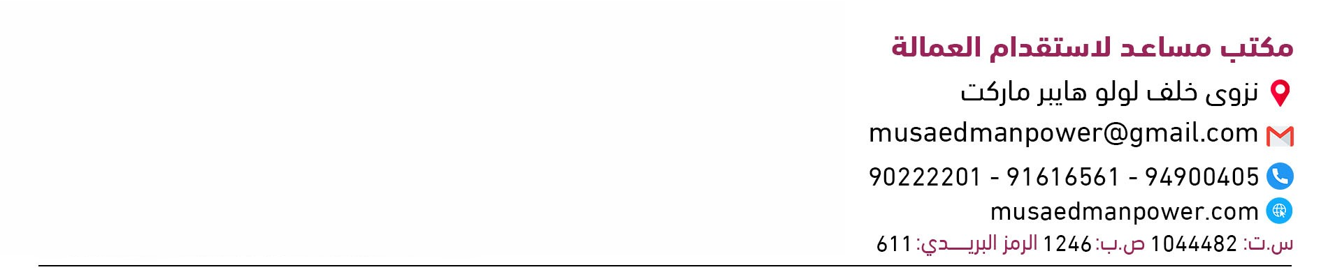 نحن في مكتب مٌساعد للاستقدام العمالة نُقدّم خدمات استقدام العمالة المنزلية والمهنية في سلطنة عُمان بجودة عالية ومصداقية تامة. نسعى لتلبية احتياجات الأفراد والعائلات والمؤسسات عبر توفير كوادر مدربة ومؤهلة من مختلف الجنسيات، بما يتوافق مع متطلبات السوق العُماني والضوابط القانونية.